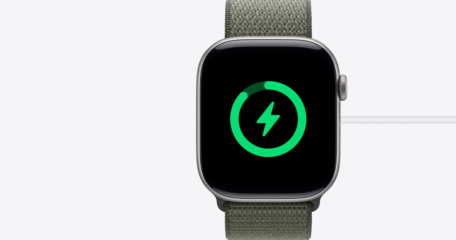 Apple Watch Series 11, silver color, aluminum case, Activity rings: Move, Exercise, Stand, right side exterior, Digital Crown dial, side button, microphone, band, neon yellow Sport Loop