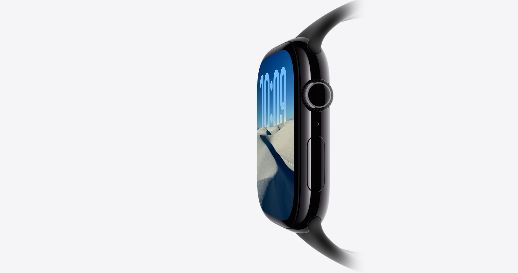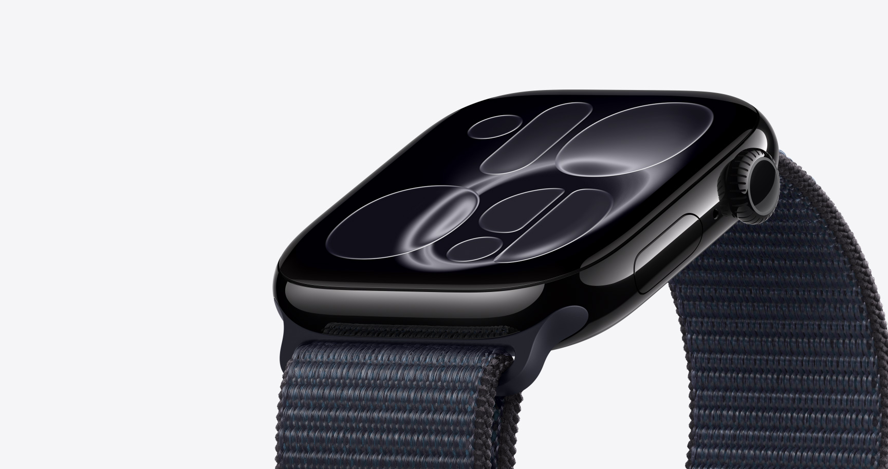 Apple Watch SE 3, aluminum case, midnight color, Flux watch face, right side exterior, Digital Crown, microphone, side button, midnight Sport Band, midnight pin-and-tuck closure