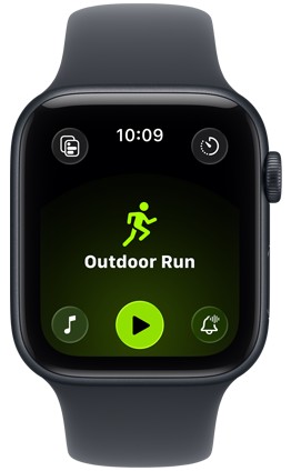 Apple Watch ent­decken Drei Apple Watch Modelle, eine Apple Watch in Natur in der Mitte, das Zifferblatt zeigt einen aktuellen Lauf mit Messwerten zur Herzfrequenz, rechts eine Apple Watch in Diamantschwarz, das Zifferblatt zeigt Genmojis, links eine Apple Watch in Roségold, das Zifferblatt zeigt Vitalzeichen