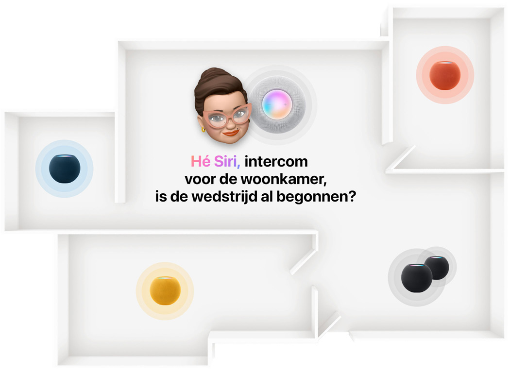 Plattegrond van een woning. In elke kamer staat een HomePod of HomePod mini. Een Memoji-personage zegt iets. De individuele speakers zijn gemarkeerd.
