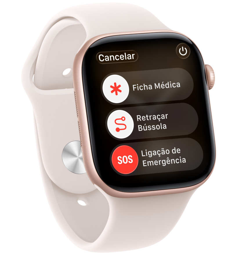 Precisa de ajuda? Mantenha pressionado o botão lateral do Apple Watch Series 11 para tentar ligar para os serviços de emergência e compartilhar sua localização19.
