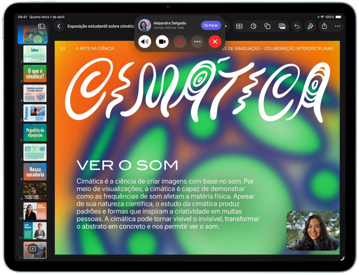 Parte da frente do iPad Air. A tela mostra um usuário participando de uma chamada FaceTime e vendo um Keynote. Atrás está a parte de trás de outro iPad Air
