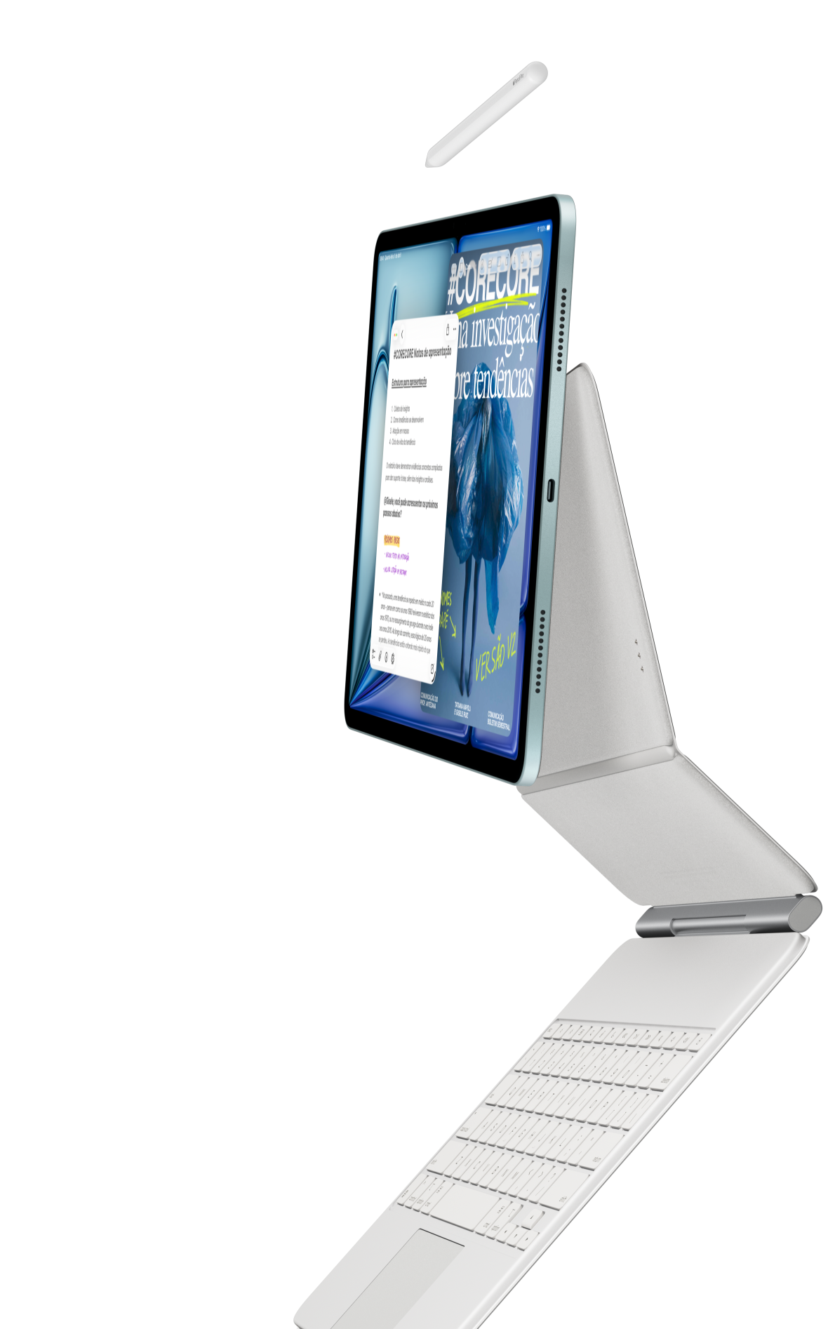 iPad Air se fixando a um Magic Keyboard para iPad Air e um Apple Pencil Pro.