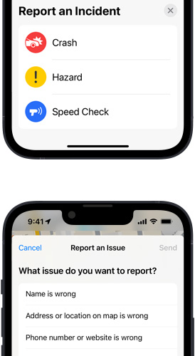 Incorrect lunch hours listed at your favourite cafe? Old mattress in the middle of the highway? Whatever issue you encounter, it’s fast and easy to report it in Maps. Edit and submit updated information about a business directly in the place card interface. And report an accident, hazard or speed check safely and easily with Siri. Just say “There’s an accident up ahead” or “There’s something on the road” and Siri will file the incident for you. If an incident displayed on the map has been cleared you can report that, too — all while keeping your hands free and your focus on the road.