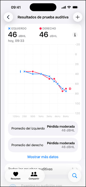 Privado, seguro y fácil. Todos los datos de tu Prueba de Audición se guardan de forma privada y segura en la app Salud de tu dispositivo. Puedes volverte a hacer la prueba en cualquier momento, monitorear tu audición a medida que pasa el tiempo, descargar los resultados y leer artículos útiles sobre salud auditiva.