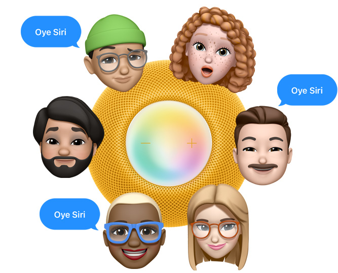 Vista desde arriba de un HomePod mini amarillo rodeado por 6 Memoji diferentes. Tres de ellos tienen una burbuja azul que dice “Oye Siri”.