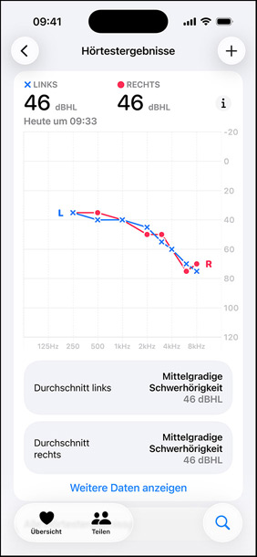 Privat, sicher und leicht zu verwalten. Alle deine Hörtest­daten werden privat und sicher in der Health App auf deinem Gerät gespeichert. Du kannst den Test jeder­zeit wieder­holen, die Entwicklung von deinem Hör­vermögen verfolgen, deine Test­ergebnisse herunter­laden und hilf­reiche Artikel über Hör­gesundheit lesen.
