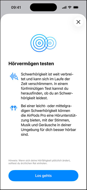Du bekommst einen Hörtest1, eine Hörgerät­funktion1 und einen aktiven Gehörschutz2 – alles, was du dazu brauchst, sind die AirPods Pro 3 oder AirPods Pro 2 und ein iPhone oder iPad. Es ist das welt­weit erste umfassende Erlebnis für Hörgesundheit.