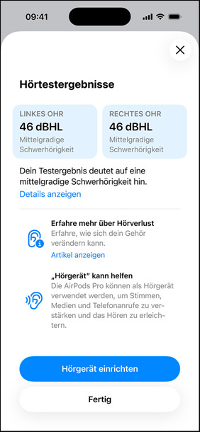 Direkte Ergebnisse. Direkte Hilfe. Wenn du den Test abgeschlossen hast, siehst du ein personalisiertes Profil mit leicht verständ­lichen Ergebnissen und Informationen über dein Gehör. Auch wenn dein Hör­vermögen kaum bis gar nicht eingeschränkt ist, kannst du dennoch davon profitieren, bestimmte Frequenzen klarer zu hören. Darum lassen sich deine Einstellungen für die Medien­unterstützung so anpassen, dass du ein noch besseres Klang­bild beim Anhören von Medien und bei Anrufen bekommst. Und falls dein Hör­vermögen leicht bis mittelstark eingeschränkt sein sollte, bekommst du die Empfehlung, die Hörgerät­funktion einzurichten.