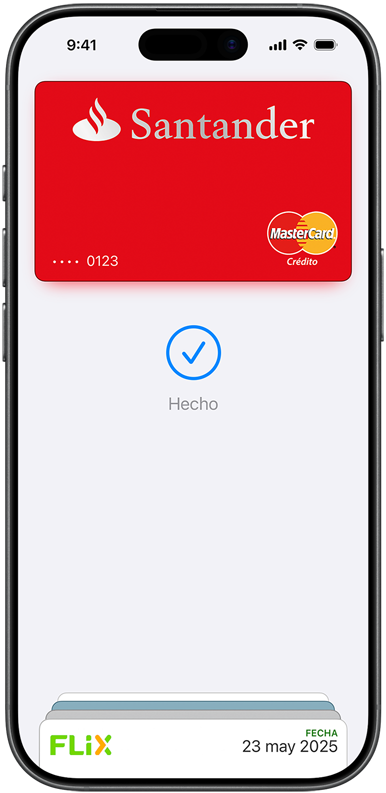 Se configura en segundos. Desde tu iPhone. Apple Pay viene integrado en el iPhone, Apple Watch, Mac y iPad. Para empezar en el iPhone, abre la app Cartera y toca el símbolo más. A continuación, añade una tarjeta de crédito o débito válida tocando con ella la parte trasera del iPhone.1 También se te preguntará si quieres añadir la tarjeta a tus otros dispositivos. Cuando vayas a pagar, solo tienes que pulsar dos veces, tocar y listo. Seguirás disfrutando de las ventajas asociadas a tus tarjetas sin perder ningún punto o recompensa.