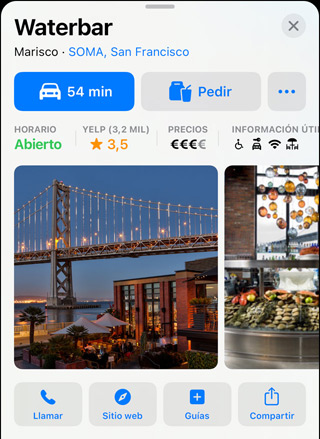 • Las guías seleccionadas son listas de lugares creadas por socios de confianza para ayudarte a encontrar sitios interesantes a los que ir a comer, comprar, quedar con amigos o, sencillamente, explorar. Mapas ofrece más de 1.000 guías seleccionadas en ciudades de todo el mundo. En iOS 15, toca Explorar Guías en Mapas para ver las guías recomendadas por los editores.