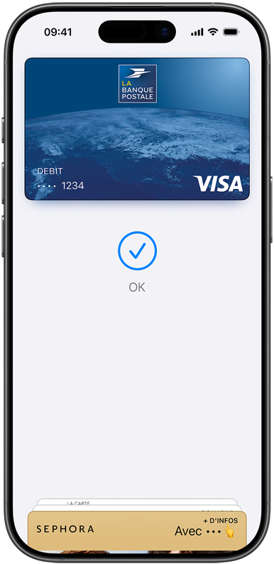 • C’est tout simple. Il vous suffit d’ajouter votre carte de crédit, de débit ou carte prépayée dans l’app Cartes sur votre iPhone. Veillez également à ajouter vos cartes à tous les autres appareils Apple que vous souhaitez utiliser avec Apple Pay. Ce service fonctionne sur iPhone, Apple Watch, Mac, iPad ou Apple Vision Pro. Si vous passez à un nouvel iPhone, vous pouvez automatiquement y transférer vos cartes en une seule étape simple.