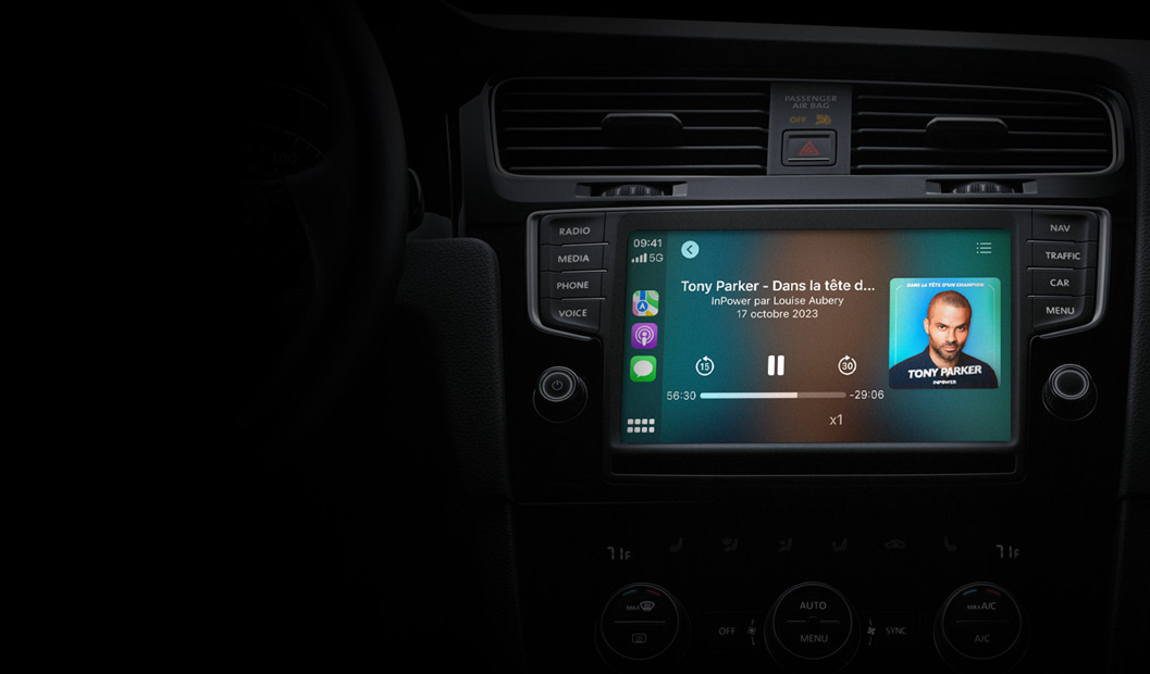 CarPlay vous permet d’écouter facilement vos contenus depuis votre iPhone dans votre voiture, en bénéficiant de la même expérience approfondie via les commandes intégrées de votre véhicule2. Vous pouvez même demander à Siri de lire le dernier épisode ou de contrôler la lecture. Et Apple Podcasts est préinstallé dans certains modèles de voitures.