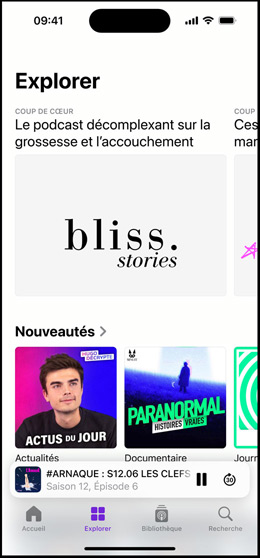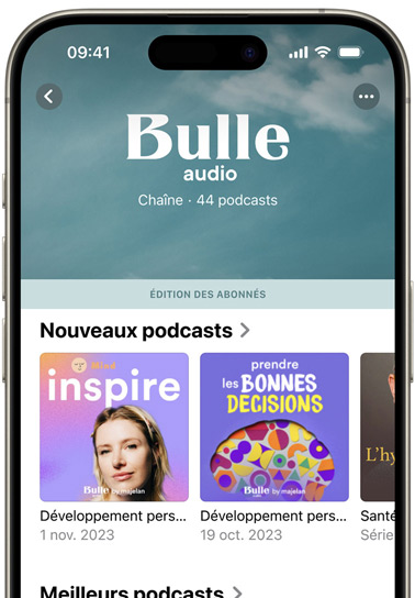 Profitez pleinement de vos émissions et personnalités préférées avec une écoute sans pub, des contenus bonus, des épisodes exclusifs et bien d’autres avantages réservés aux personnes abonnées1. Vous pouvez également rattacher vos abonne­ments à Apple Music et aux meilleures apps de l’App Store afin d’accéder à tous vos contenus audio premium depuis un seul et même endroit.