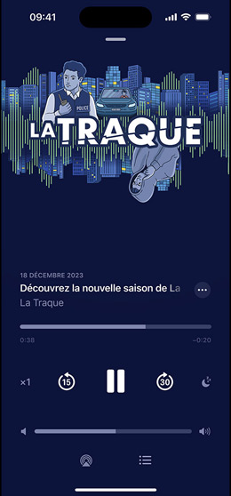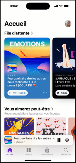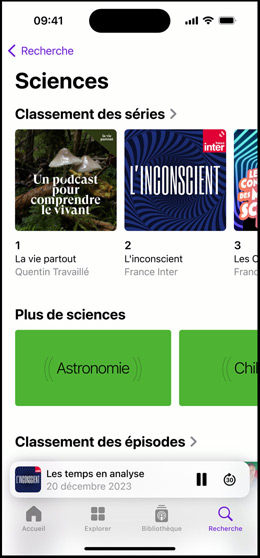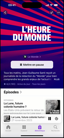 • Oui. Vous pouvez télécharger n’importe quel épisode et l’écouter hors ligne. Les nouveaux épisodes des podcasts que vous suivez se téléchargeront automatique­ment. Et vous les retrouverez tous dans votre bibliothèque, dans la section Téléchargés.