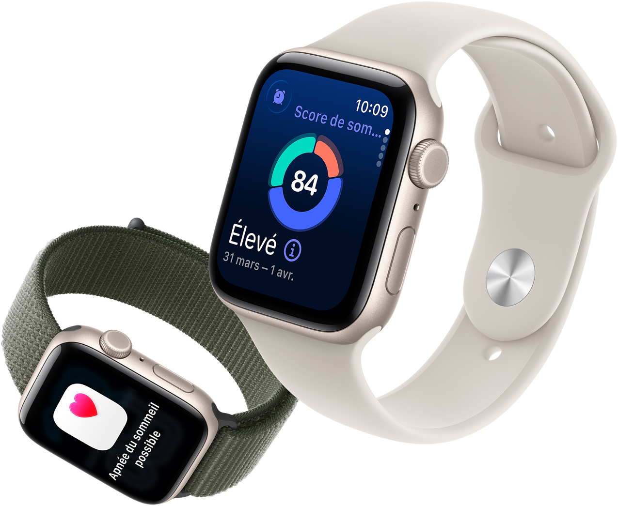 Pour profiter de données utiles au sujet de votre santé, il vous suffit de porter votre Apple Watch SE 3. Un capteur de tempé­rature innovant au poignet génère des données plus complètes dans l’app Signes vitaux et des estimations d’ovulation rétrospectives dans l’app Suivi de cycle. Vous recevez égale­ment un Score de sommeil quotidien, et des notifi­cations de possible apnée du sommeil si des signes sont détectés. Il n’a jamais été aussi simple de prendre soin de soi.