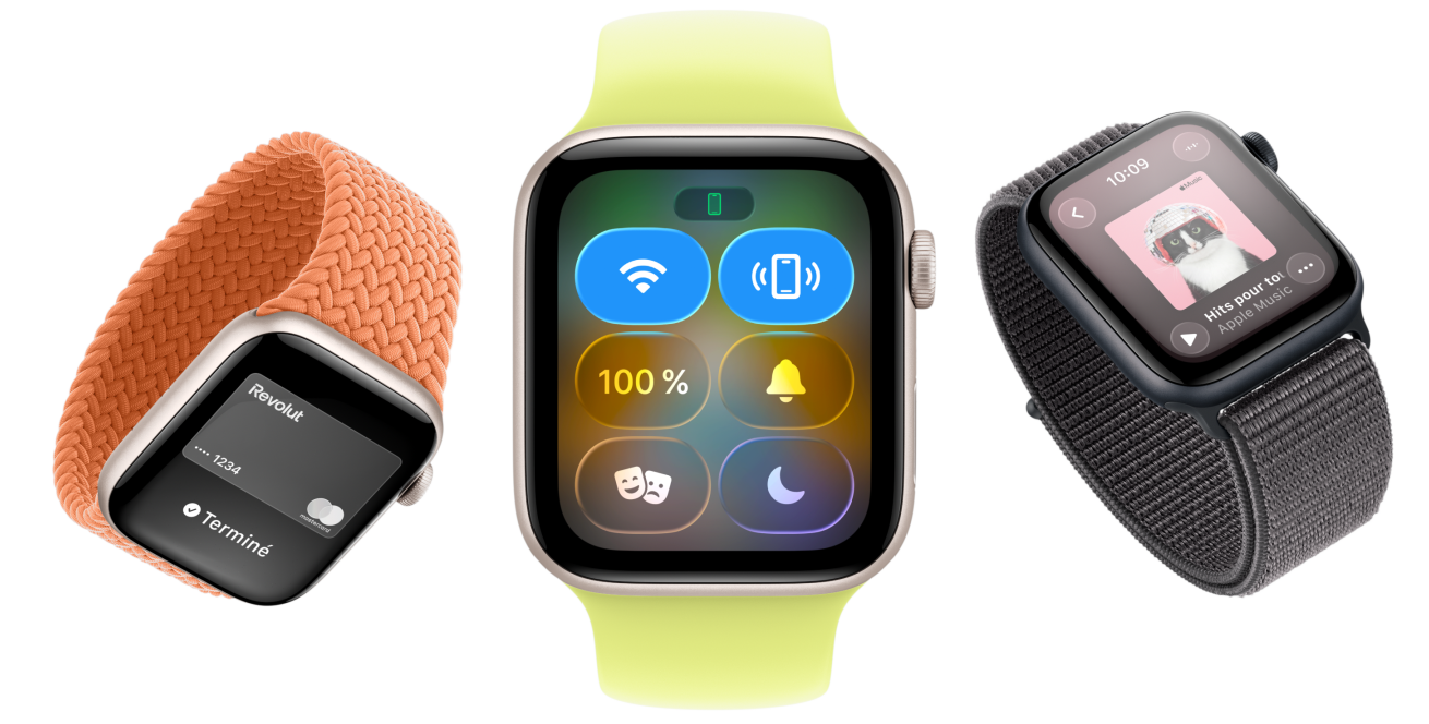 Apple Watch SE 3, boîtiers en aluminium, lumière stellaire et minuit, Boucle unique tressée, curcuma, Boucle Solo, jaune fluo, Boucle Sport, gris foncé, écrans : Apple Pay, Centre de contrôle, Apple Music