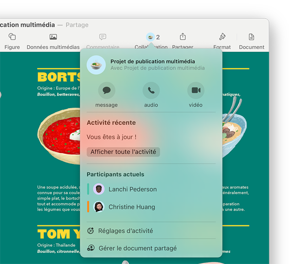 Collaborez et partagez facilement vos fichiers, dossiers, documents et autres contenus lorsque vous êtes en déplacement. Il vous suffit d’envoyer un lien privé et de choisir qui peut afficher, partager ou modifier le projet. Et grâce aux actualisations en temps réel, vous pouvez voir les changements s’opérer en direct.