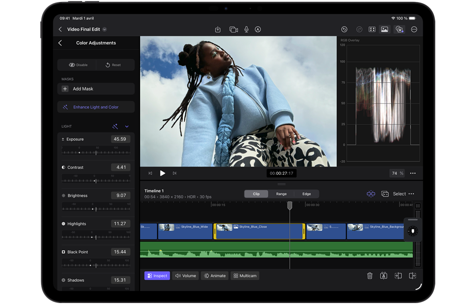 Tournez, montez et partagez vos vidéos depuis un même appa­reil doté d’un système caméra pro avec scanner LiDAR, de micros de qualité studio et de quatre haut‑parleurs. Filmez en ProRes 4K, enregistrez un podcast et choisissez le micro le plus adapté à chaque app grâce au sélecteur d’entrée.