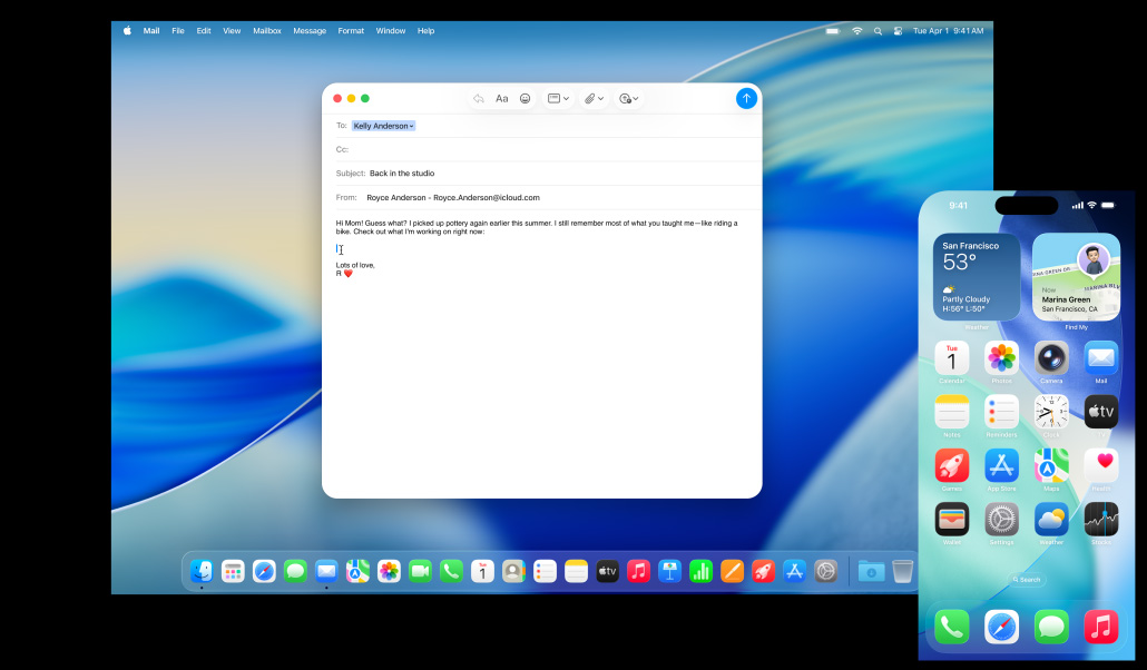 透過相機接續互通功能,你用 iPhone 拍攝的相片,可即時在你的 Mac 上電郵顯示出來;用 iPhone 掃描的收據,可直接在訊息 app 出現,並已自動裁剪和拉直,隨時都可分享出去。相機接續互通功能可與備忘錄、Pages 和 Keynote 等眾多 app 配合使用,令 iPhone 與 Mac 之間的合作,更合拍。相機接續互通功能更為視像通話解鎖不同新功能,例如當你使用 FaceTime 及 Zoom,可利用桌上視角功能,以俯視角度展示自己的工作空間;而在視像通話中,人物置中功能更會隨你移動,讓你時刻保持入鏡。
