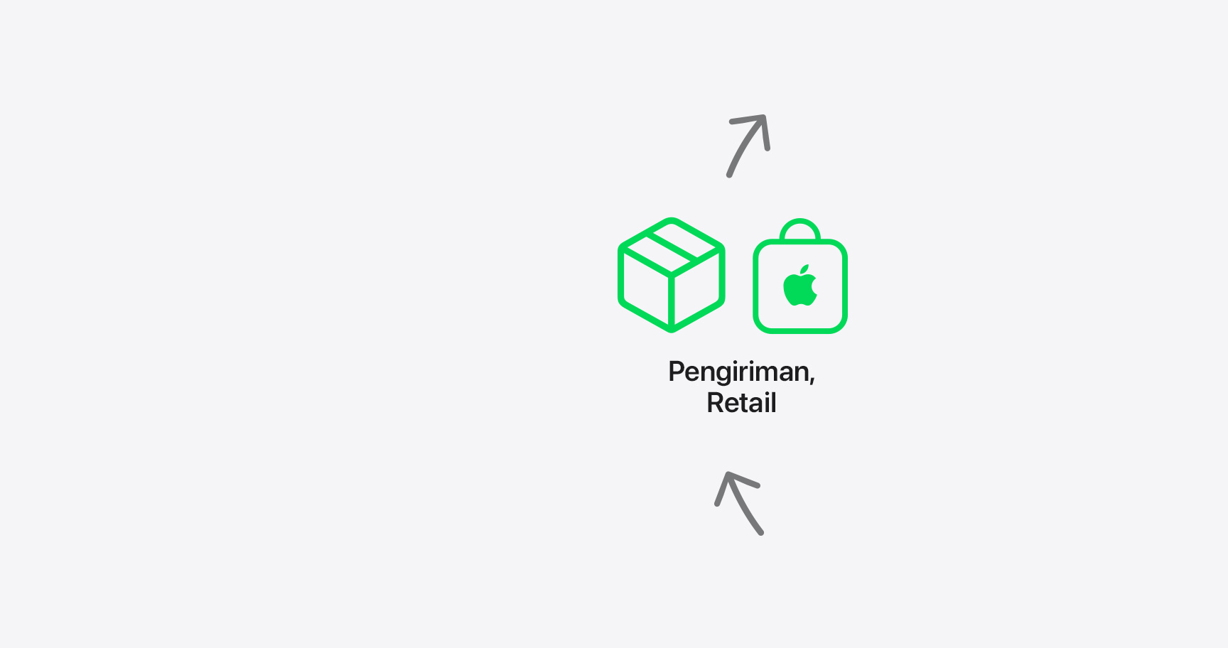 Kemasan dan Pengiriman. Melalui pemasok, kami bisa mengirimkan produk jadi buatan Apple ke seluruh dunia, termasuk ke toko retail kami dan langsung ke pelanggan kami.