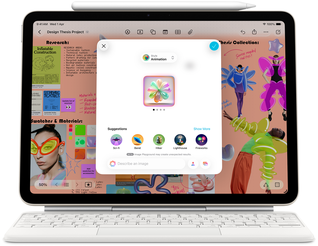 Landscape view of iPad Air showcasing Apple Intelligence with Image Wand in Notes, Apple Pencil Pro