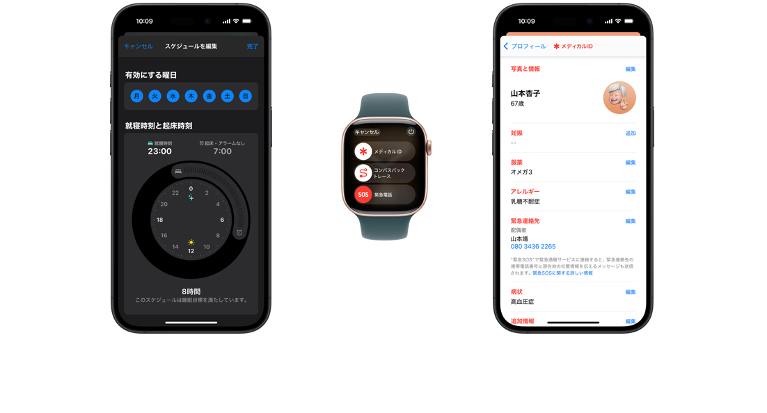 iPhoneとApple Watchでは、アレルギー、血液型、緊急連絡先などの重要情報が保存されたメディカルIDに、救急隊員がすばやくアクセスできます。