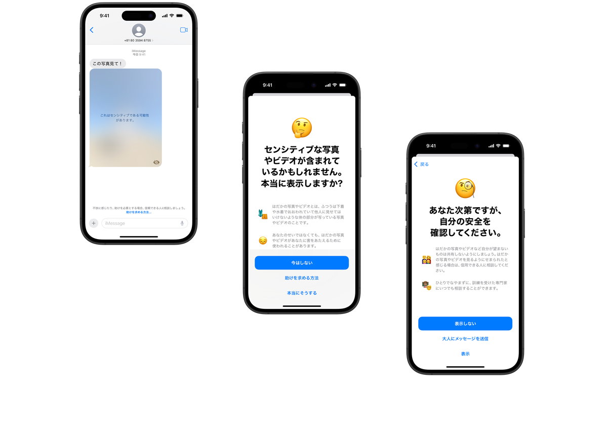 iOS、iPadOS、macOSの最新バージョンでは、子どもが使っているデバイスでヌードを含む画像が送受信された時に、警告するように設定できます。画像がぼかされ、役立つ関連情報とともに警告を表示。さらに、信頼できる人にメッセージを送って助けを求めるオプションも提示します。常にエンドツーエンドの暗号化で守られるので、Appleがそのメッセージにアクセスすることはありません。