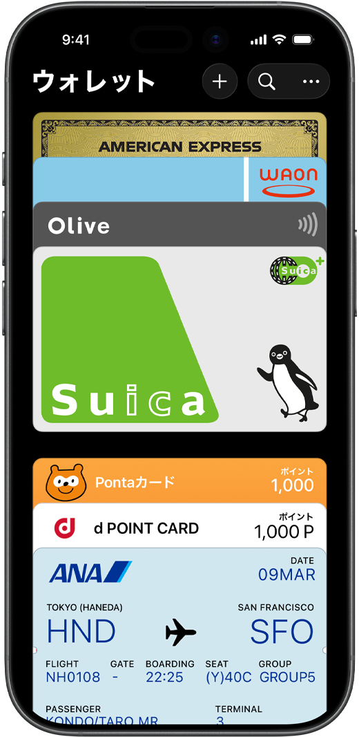 • ウォレットは、iPhoneとApple Watchで使えるアプリです。クレジットカードなどのカード、Suica、PASMO、ICOCA、搭乗券、チケット、マイナンバーカード、車のキー、ポイントカードなど、すべてを一つの場所で安全かつ便利に管理できます。