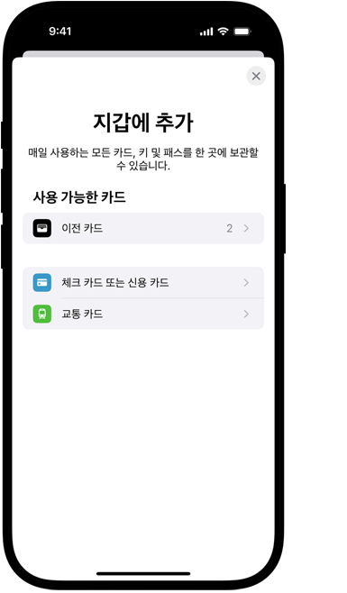 • 신용카드에 포함된 교통카드 기능 및 후불제 교통카드는 Apple 지갑에서 지원되지 않습니다.
