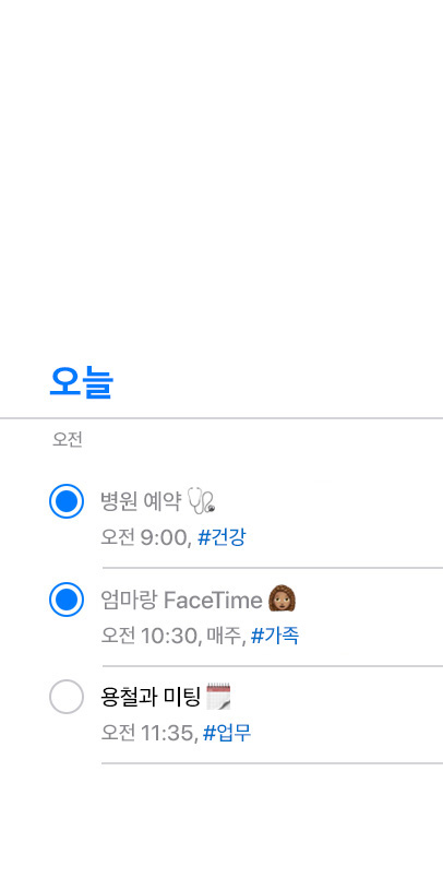 할 일 목록부터 프로젝트 작업 내용까지 모든 것을 놓치지 않고 기억하는 법. 이동 중에도 Siri로 빠르게 미리 알림을 생성할 수 있고, 강력한 도구들을 이용해 목록과 알림을 맞춤 설정할 수도 있습니다.