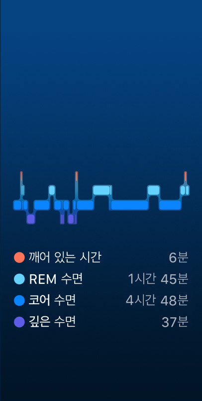 매일매일의 건강 상태를 손목에서 바로 이해할 수 있습니다. Apple Watch를 착용하고 수면을 취하면 평균 심박수, 호흡수, 혈중 산소 농도,6