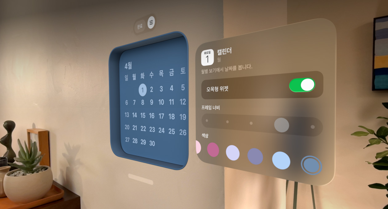 ‘사진’, ‘시계’, ‘음악’, ‘캘린더’와 같이 즐겨 찾는 위젯을 바로바로 확인 가능한 위치에 고정해 둘 수 있습니다. 위젯의 프레임 두께, 색상, 깊이를 맞춤화하는 것도 가능합니다. 이렇게 당신이 원하는 방식으로 위젯들을 배치해 둔 공간은 Apple Vision Pro를 착용할 때마다 그대로 유지되죠.