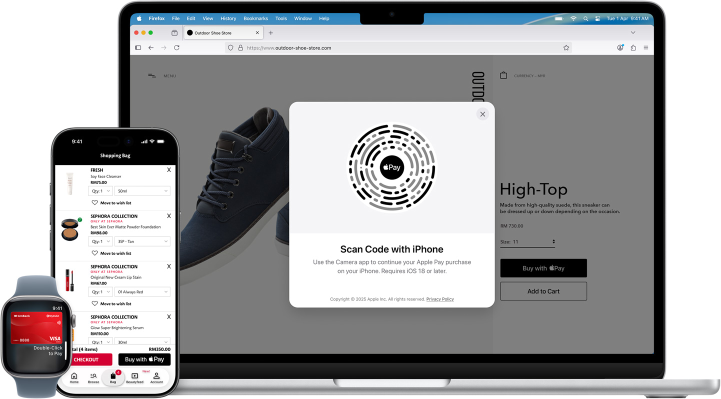 In apps and online. Use Apple Pay to seamlessly make purchases in Safari and other browsers — on iPhone, iPad, Mac and other computers — without the lengthy checkout forms. On an Apple device, click or tap the Apple Pay button and pay with a touch or glance. On a non‑Safari browser, scan the Apple Pay code with your iPhone camera and use your iPhone to complete your purchase.2