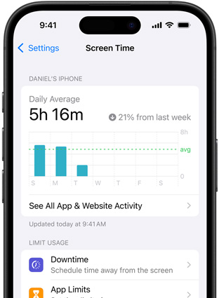 Screen Time gives you a better understanding of the time you and your kids spend using apps, visiting websites and on your devices overall. You can get weekly reports or see specific app usage, notifications and device pickups.