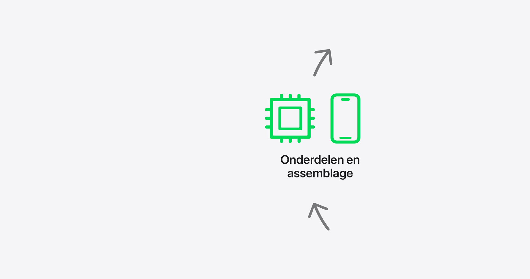Productie. Onze toeleveranciers helpen ons onderdelen te maken die samen essentiële componenten vormen, zoals displays, batterijen en chips. Deze componenten worden geassembleerd tot Apple producten.