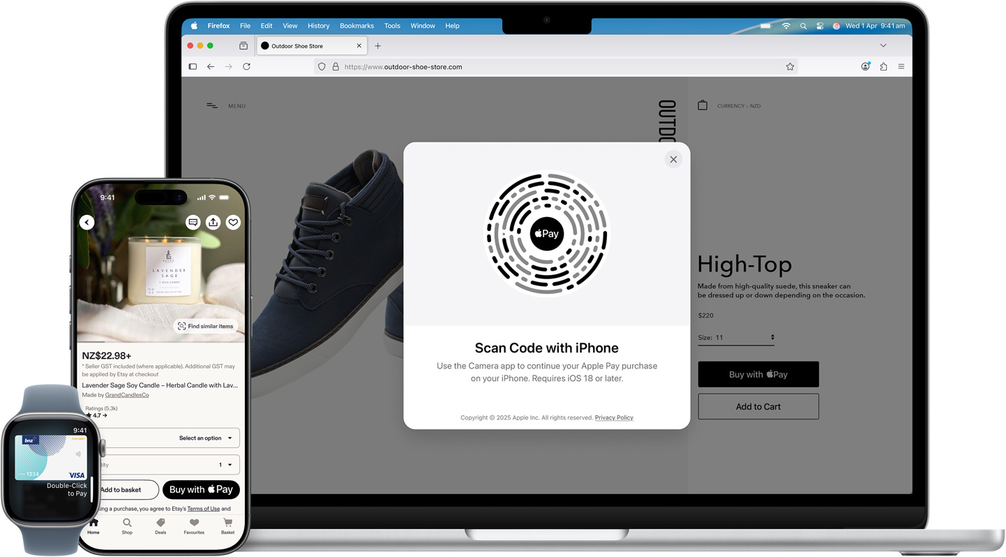 In apps and online. Use Apple Pay to seamlessly make purchases in Safari and other browsers — on iPhone, iPad, Mac and other computers — without the lengthy check-out forms. On an Apple device, click or tap the Apple Pay button and pay with a touch or glance. On a non-Apple device, scan the Apple Pay code with your iPhone camera and use your iPhone to complete your purchase.2 You can even use Apple Pay to subscribe to services like Apple Music and Apple TV, buy apps and games on the App Store, and upgrade your iCloud storage.