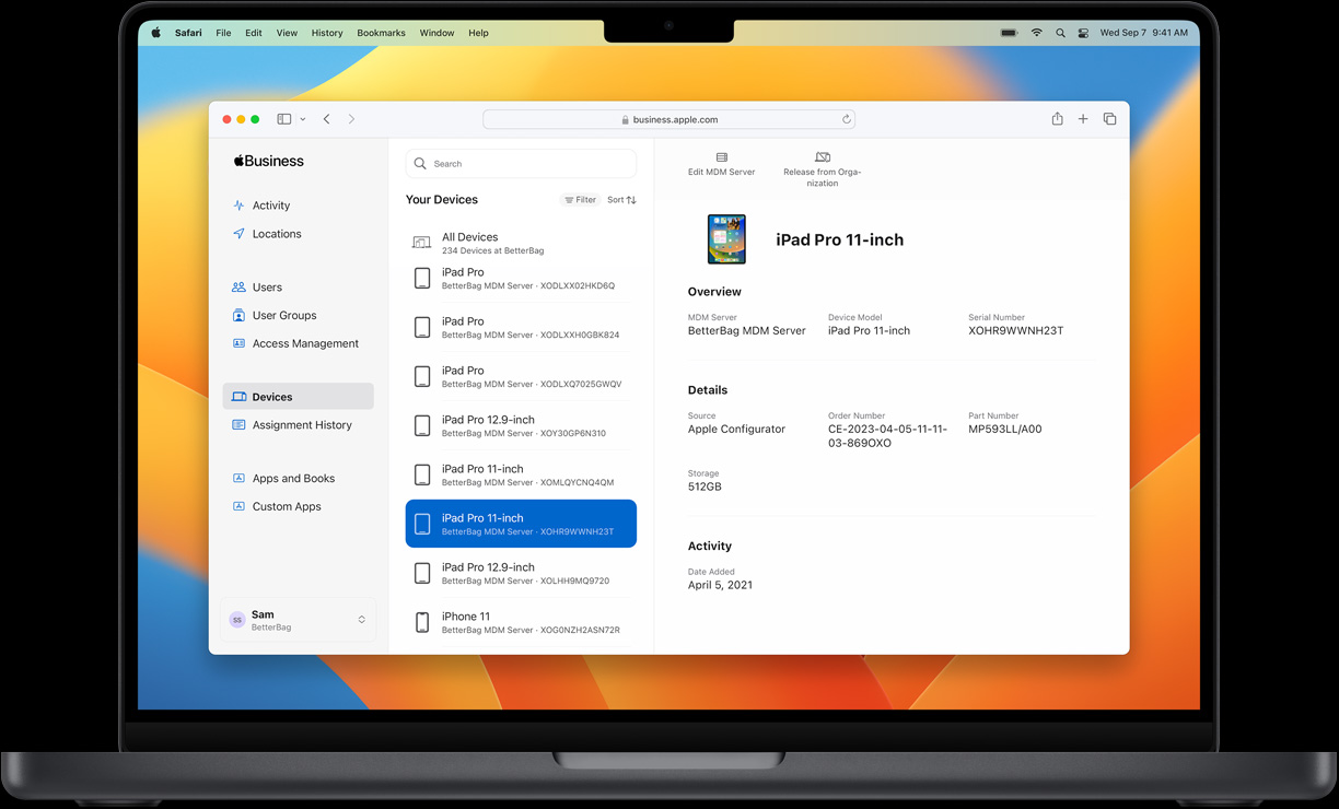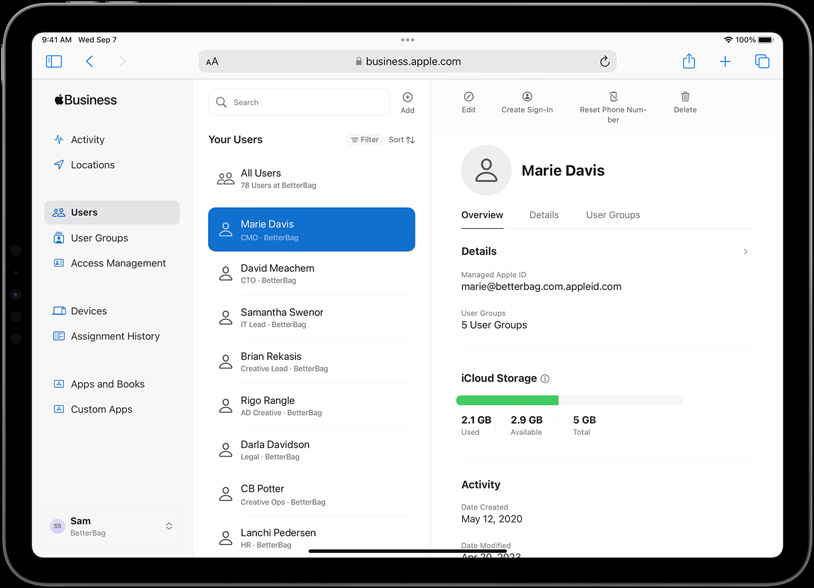 Apple Business Manager is a free, web-based portal that lets IT safely set up devices and distribute apps from anywhere. IT can create Managed Apple Accounts for users, assign new