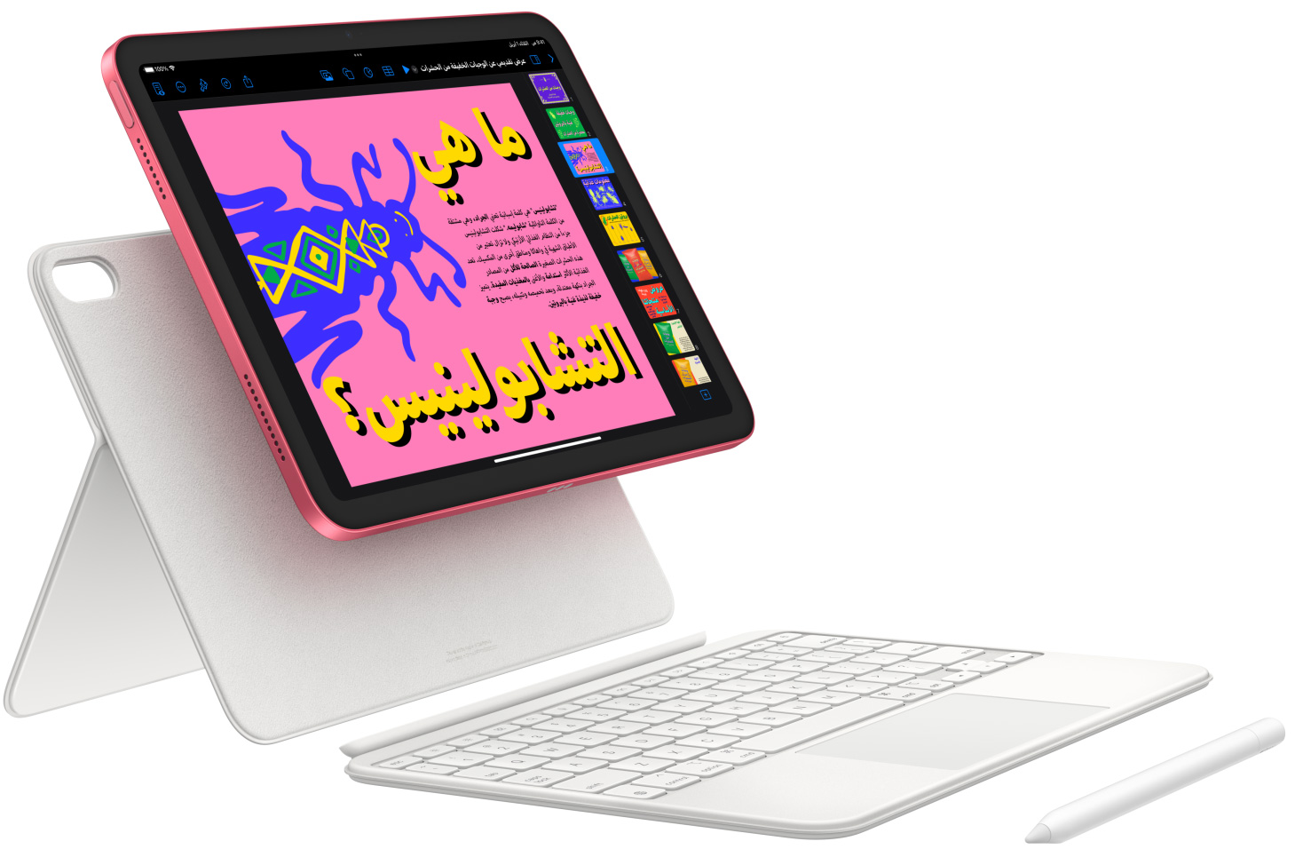 ارسم ولوّن ودوّن بقلم Apple. ومع المحفظة بلوحة مفاتيح ماجيك متعددة الاستعمالات والمصممة من قطعتين، يمكنك الاسترسال في الطباعة واستخدام لوحة التعقب والاستمتاع بمشاهدة كل ما تريد على راحتك.2 ويمكنك أيضاً الاستعانة باختصارات لوحة المفاتيح التي تعرفها وتحبها، أو النقر أينما تشاء على لوحة التعقب. إنها تجربة طباعة مذهلة بالطبع.