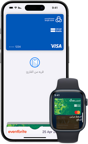 • Apple لا تشارك أرقام بطاقاتك الفعلية مع التجار ولا تخزَّن على سيرفراتها إطلاقاً، فمعلومات بطاقاتك تُربط بكل أمان بحساب Apple الخاص بك لمساعدتك على إضافة بطاقاتك وتذاكرك وإدارتها عبر مختلف أجهزتك.