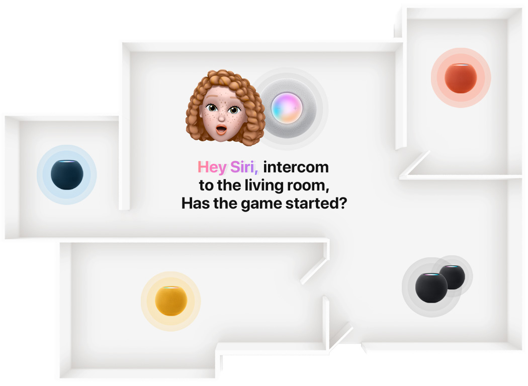 With more than one HomePod mini in the house, you can easily communicate with your family members by voice using Intercom. Ask Siri to send your message to the whole house or to individual rooms — and everyone can easily respond.