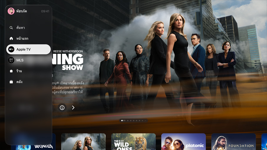 โทรทัศน์จอแบนแสดง UI หน้าจอโฮมของแอป Apple TV