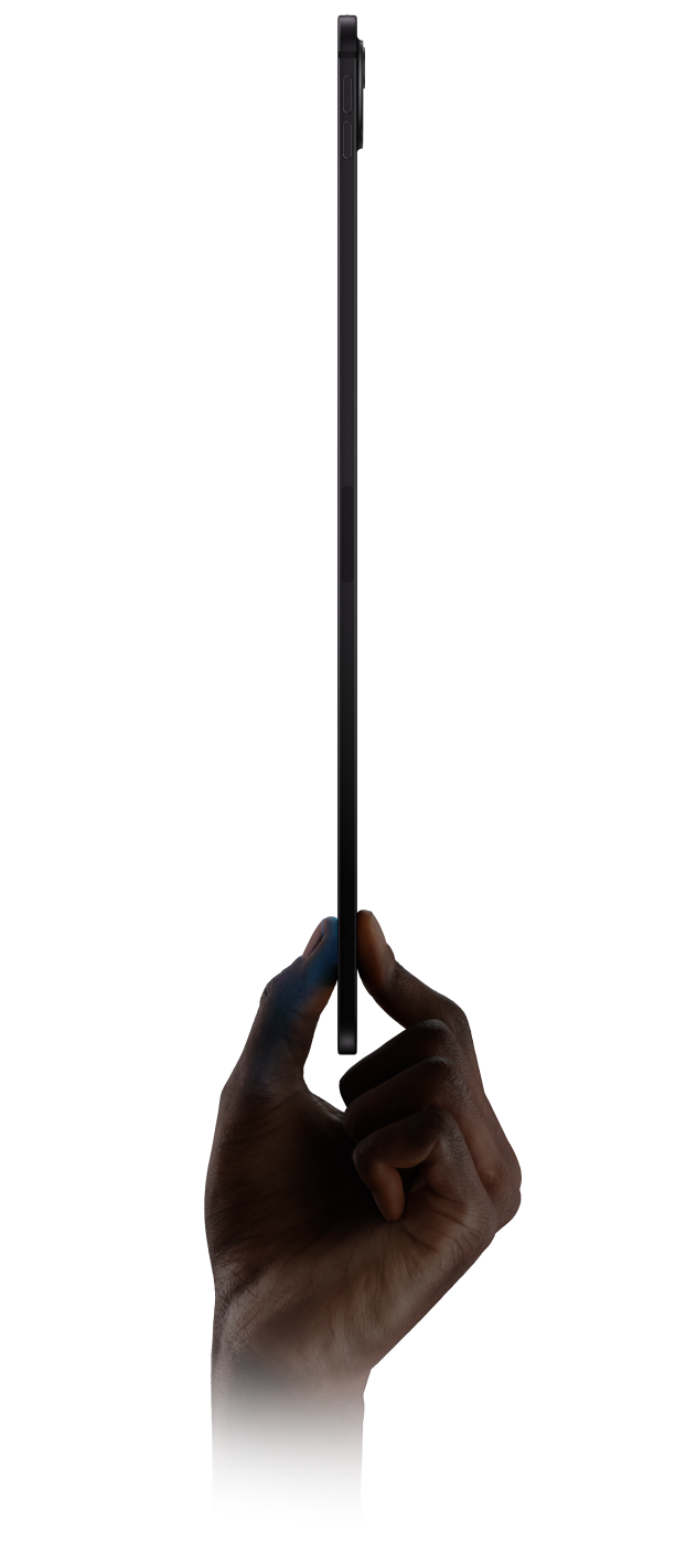 iPad Pro, front exterior, portrait orientation, space black colour, display with digital art of a futuristic character with blue skin and braided hair, hand holding up iPad Pro from the bottom between thumb and index finger portraying thin design