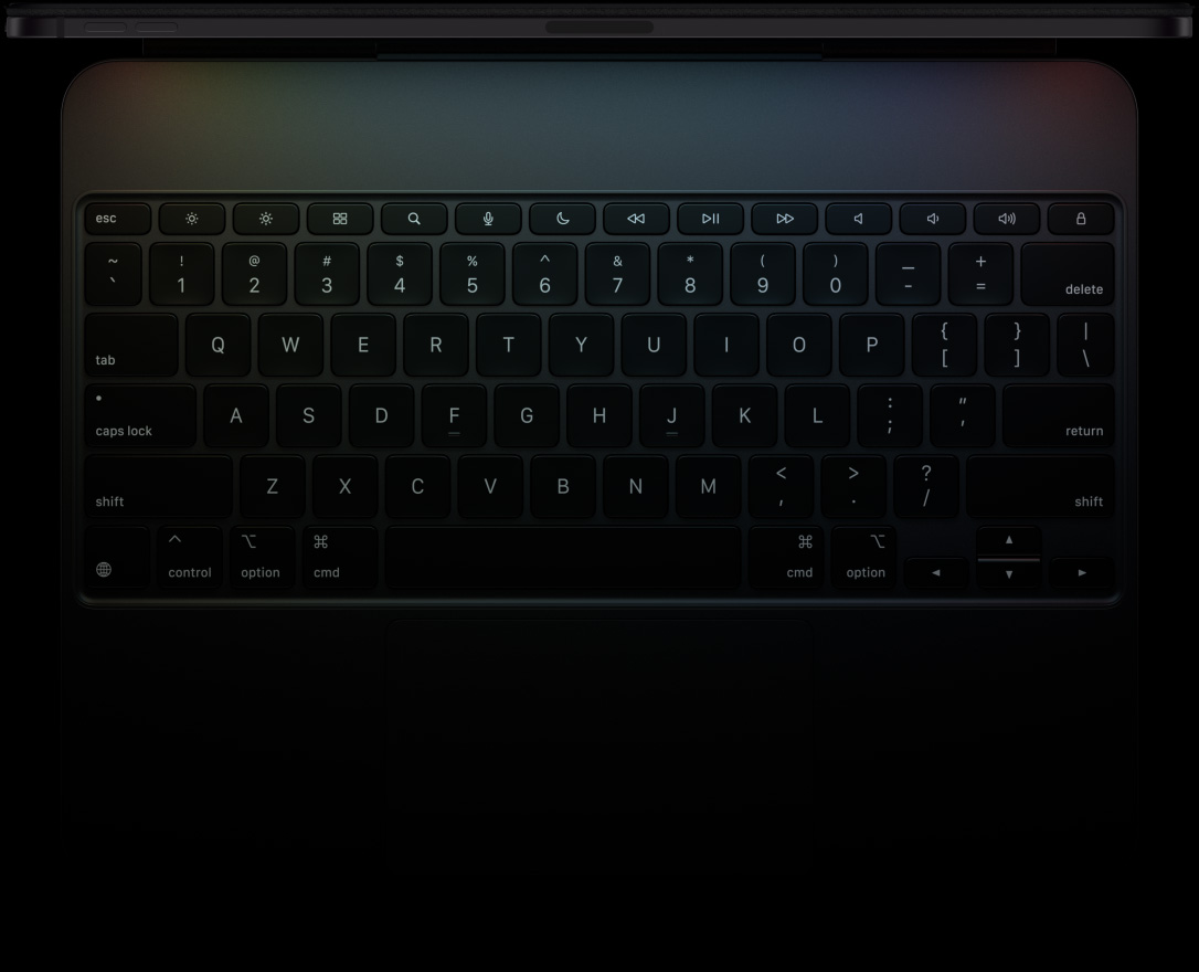 iPad Pro, landscape orientation, space black colour, top edge profile, attached to Magic Keyboard, front exterior, landscape orientation, black colour, backlit keys, dedicated function key row, escape, tab, caps lock, shift, control, option, shift, delete, return, inverted-T arrow keys, built-in trackpad